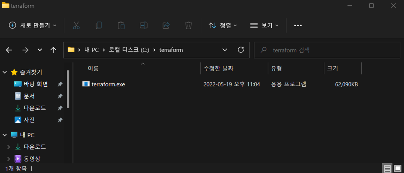 3. 압축 해제한 파일을 c:\terraform 으로 이동합니다.