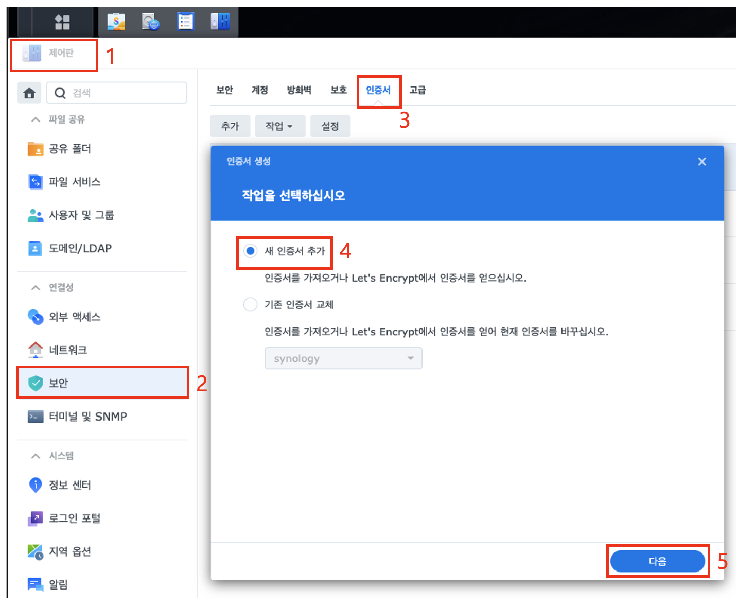 Synology 자체에서 인증서 발급 기능을 지원하지만,